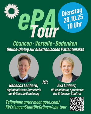 Am Dienstag, 28. Oktober, um 19:00 Uhr lädt OB-Kandidatin Eva Linhart herzlich zur Online-Veranstaltung zur elektronischen Patientenakte (ePA) ein. Gemeinsam mit Rebecca Lehnhard, digitalpolitische Sprecherin der Grünen im Bundestag, sprechen wir darüber, wie die ePA unseren Gesundheitsalltag verändert und welche Chancen sie für eine moderne, vernetzte Versorgung bietet.