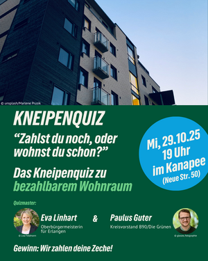 Teste dein Wissen über Wohnungspolitik, Mietpreisbremse und grüne Lösungen gegen Wohnungsnot mit unseren Quizmasters Eva Linhart, unsere OB-Kandidatin, und Paulus Guter vom Vorstand der Erlanger Grünen.