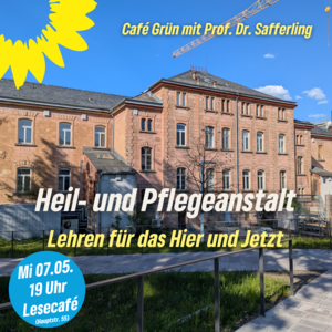 Der Grüne Kreisverband lädt ein zum Café Grün mit Prof. Dr. Christoph Safferling, Lehrstuhl für Strafrecht, Strafprozessrecht, Internationales Strafrecht und Völkerrecht an der FAU. Nach einem Input zur Geschichte der Einrichtung, den aktuellen Plänen zum Gedenk- und Lernort sowie Lehren für die heutige Stadtgesellschaft bietet die Veranstaltung Raum für Fragen und Diskussion.