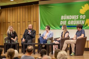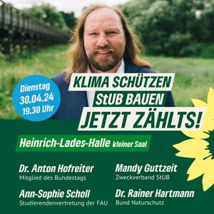 Am 14. Februar lud unser Kreisverband zur Podiumsdiskussion mit Toni Hofreiter, dem Vorsitzenden der grünen Bundestagsfraktion, Esther Schuck, der ersten Vorsitzenden der Bürgerinitiative „Umweltverträgliche Mobilität im Schwabachtal“ und dem verkehrspolitischen Sprecher der Erlanger Grüne-Liste-Fraktion Harald Bußmann ein, um insbesondere die urgrünen Aspekte des geplanten Projektes einer Stadt-Umland-Bahn (StUB) zu beleuchten. Im mit circa 150 Gästen voll besetzten Innenhof der Stadtbibliothek im historischen Bürgerpalais Stutterheim fanden sich überwiegend StUB-Befürworter*innen - aber selbstverständlich auch Unentschlossene und kritische Stimmen.